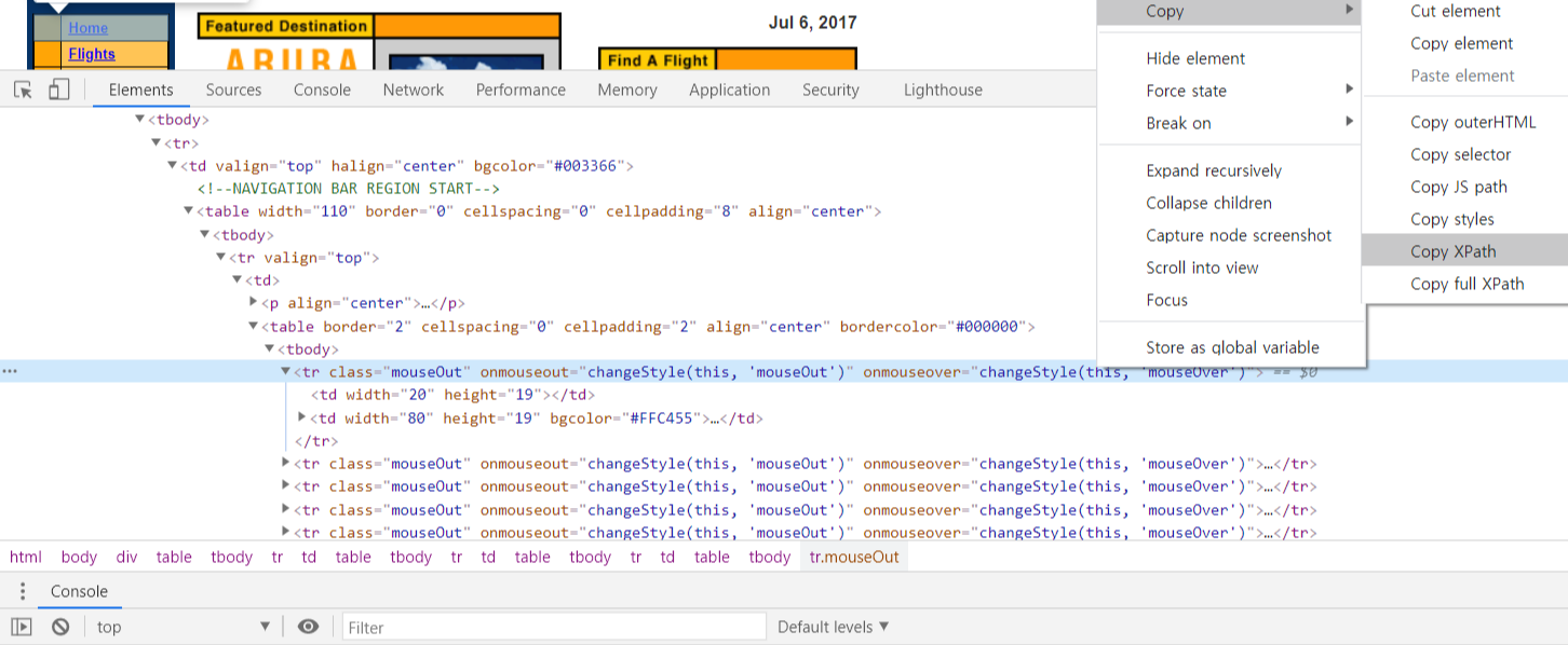 Home이라는 링크txt를 찾아 그 위에 마우스 오버를 하면, xpath를 활용하여 그 행의 색깔을 출력하도록 한다