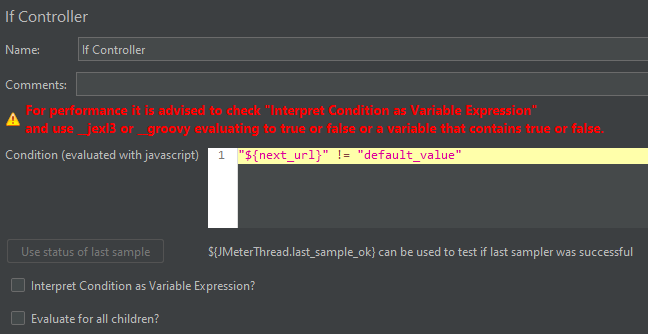 이제 If Controller에서 Condition을 "${next_url}" != "default_value" 로 설정합니다