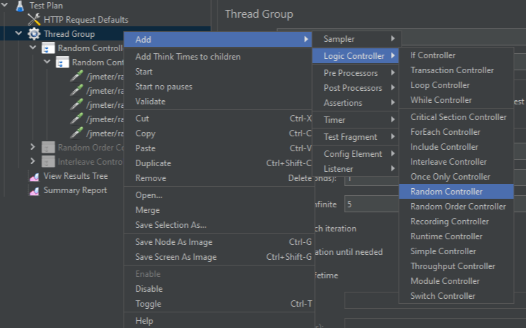 Logic Controller에서 Random Controller를 추가하여 테스트할 Sampler를 추가합니다