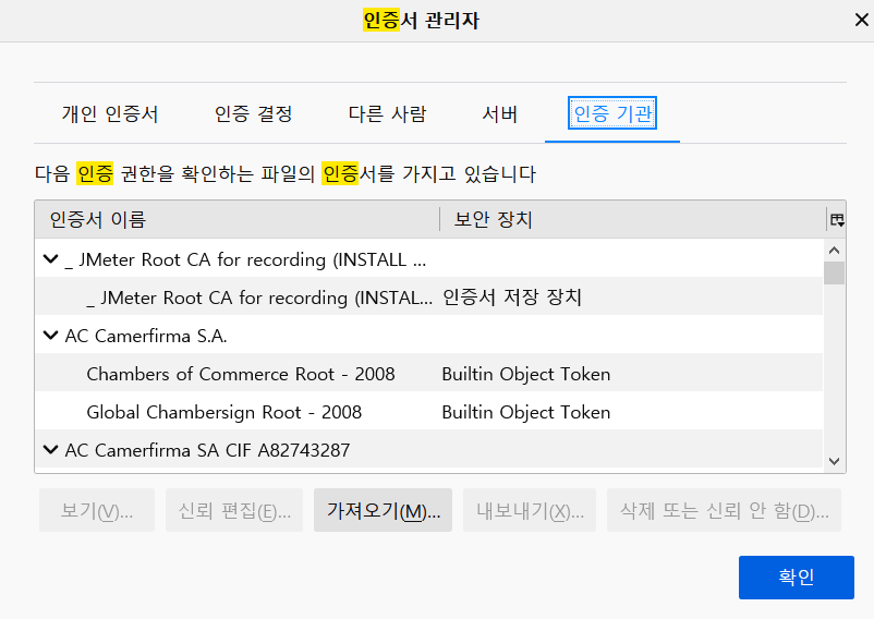 가져오기 버튼을 눌러 생성된 인증서를 추가합니다